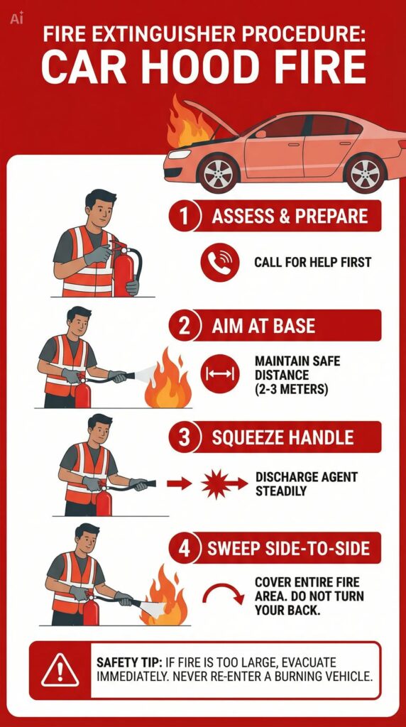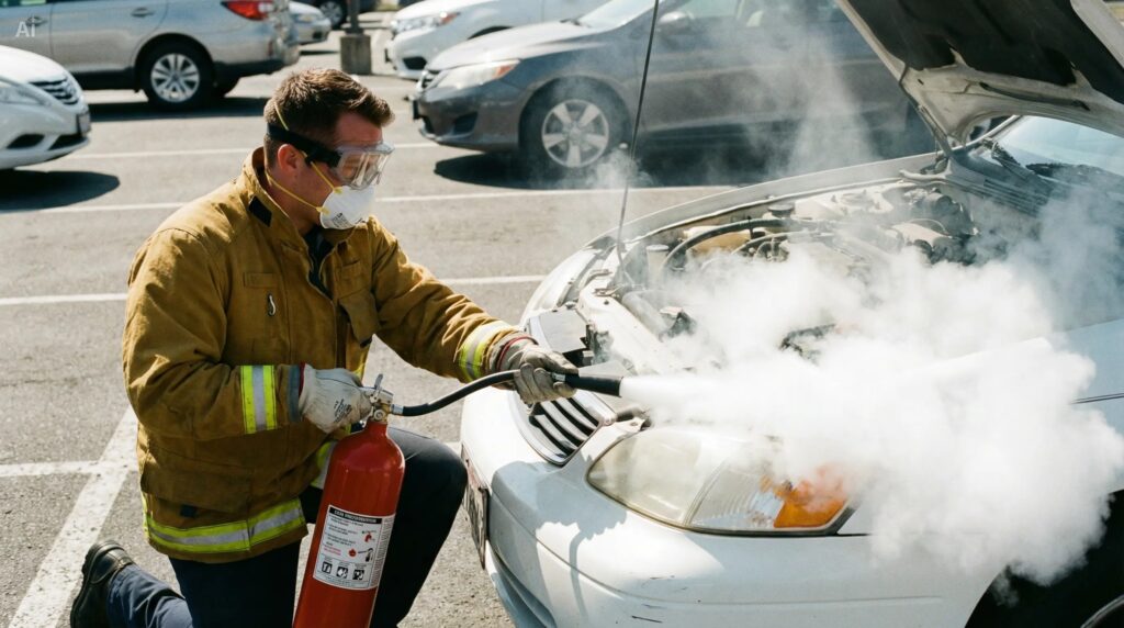 (Ảnh bìa: Sử dụng bình chữa cháy dập lửa trên capo xe ô tô – Cách dùng bình chữa cháy cho xe ô tô hiệu quả)