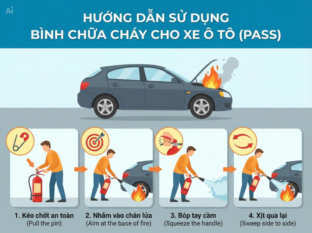 Hướng dẫn chi tiết cách dùng bình chữa cháy cho xe ô tô với các bước an toàn, checklist và lưu ý quan trọng theo tiêu chuẩn PCCC.