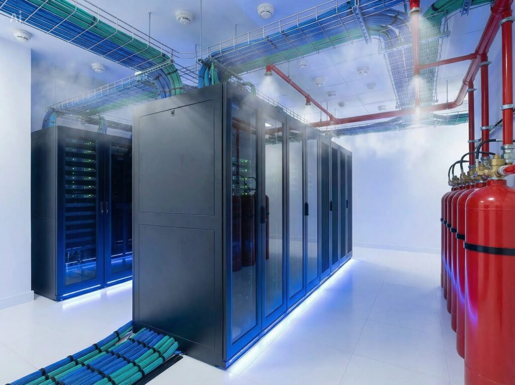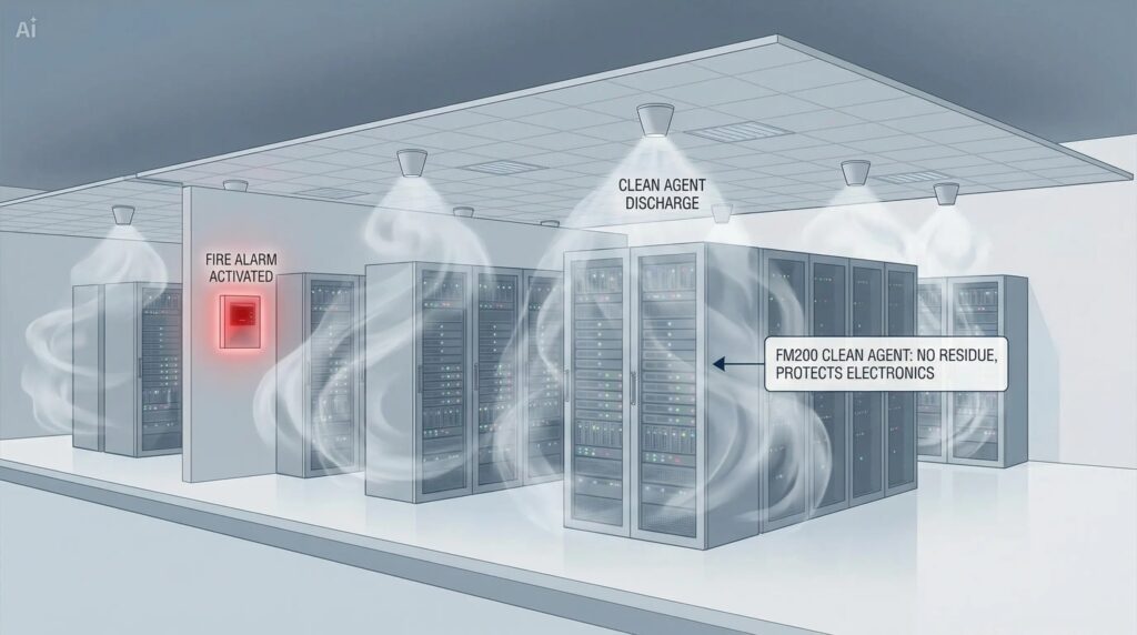 (Hình minh họa: Hệ thống FM200 phun khí trong phòng server – Chữa cháy nhanh, không hư hại thiết bị)