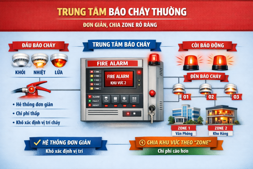 • Báo cháy thường (Conventional): Hệ thống chia khu vực (zone) theo nhóm đầu dò. Khi có cháy, trung tâm chỉ biết cháy xảy ra ở zone nào (ví dụ: tầng 3), chứ không xác định chính xác vị trí đầu báo nào kích hoạt.