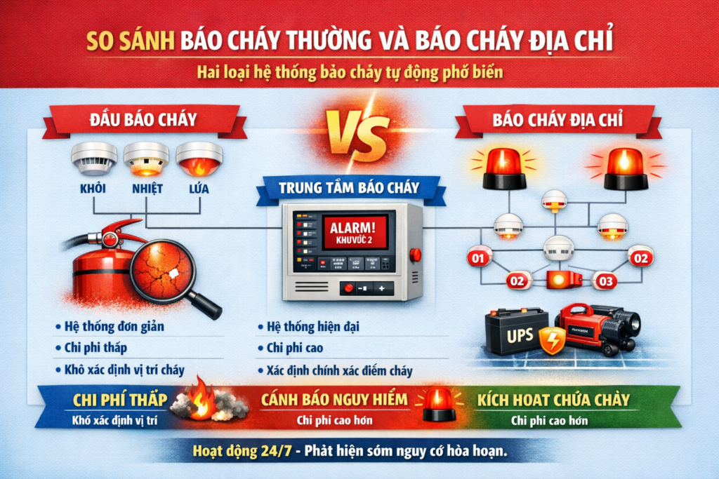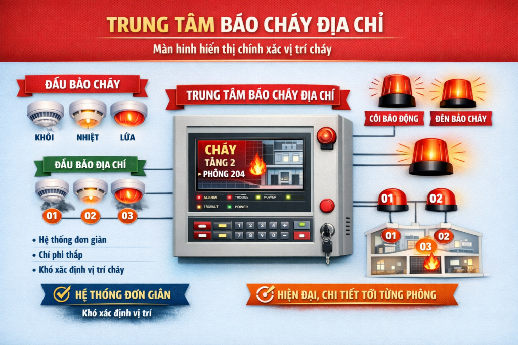Tìm hiểu so sánh báo cháy thường và báo cháy địa chỉ với thông tin đầy đủ, dễ hiểu và áp dụng đúng chuẩn PCCC.