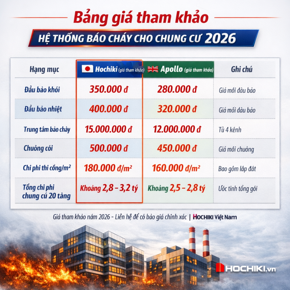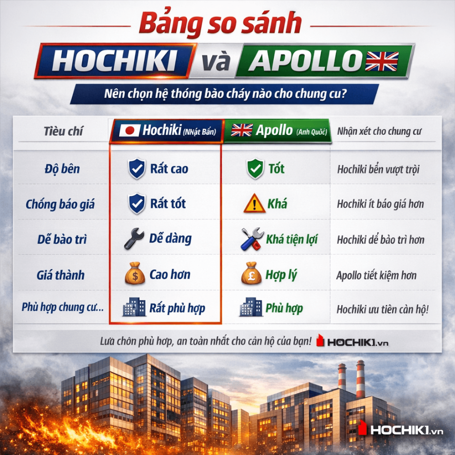 Trong bối cảnh quy định phòng cháy chữa cháy 2026 ngày càng nghiêm ngặt, việc lựa chọn hệ thống báo cháy tự động cho chung cư trở nên quan trọng hơn bao giờ hết. Hai thương hiệu được nhiều chủ đầu tư và ban quản lý chung cư cân nhắc nhất hiện nay là Hochiki (Nhật Bản) và Apollo (Anh Quốc)